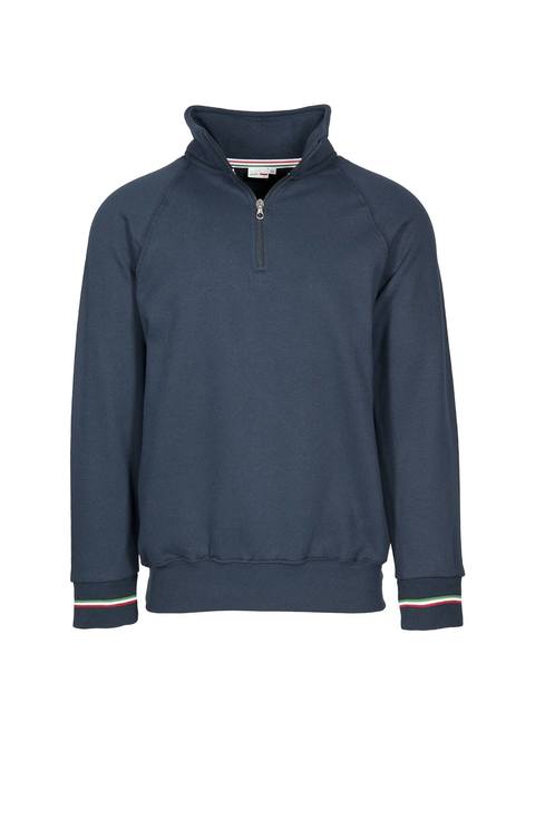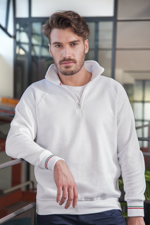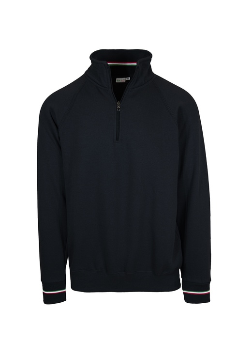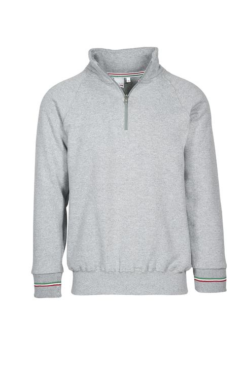 Felpa collo zip tricolore Manica raglan Finiture in tricolore italiano sul polso ed interno collo Produzione interamente italiana dal filato al prodotto finito – Tracciabilità certificata